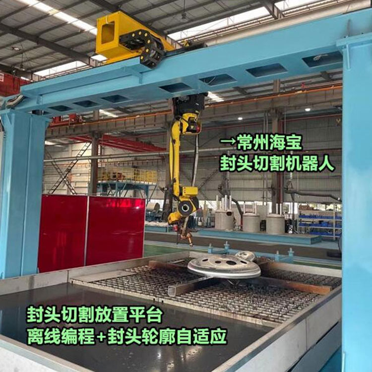 • 常州海寶焊割-等離子機器人封頭開孔機器人,通過采用日本發那科機器人,核心的自動編程軟件,實現了小批量多品種的封頭自動化切割,方案和SolidWorks內嵌的小程序結合。作為對比,原來畫個開孔封頭要至少30分鐘,現在只要2分鐘就能生產,速度提升無數倍,SolidWorks模型自動計算割縫信息,方案采用先進的三維切割技術,自動識別封頭,定位割縫,自動完成機器人軌跡和編程,整個過程避免了繁瑣的示教,簡單好用,真正實現了封頭切割生產的智能化和自動化。