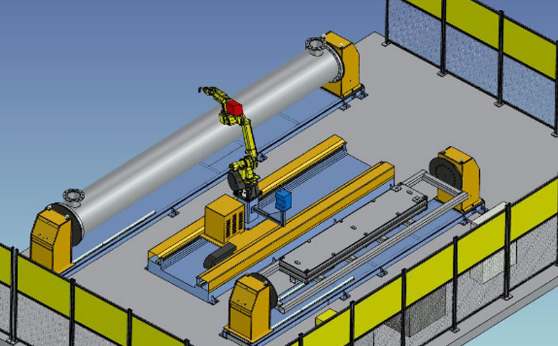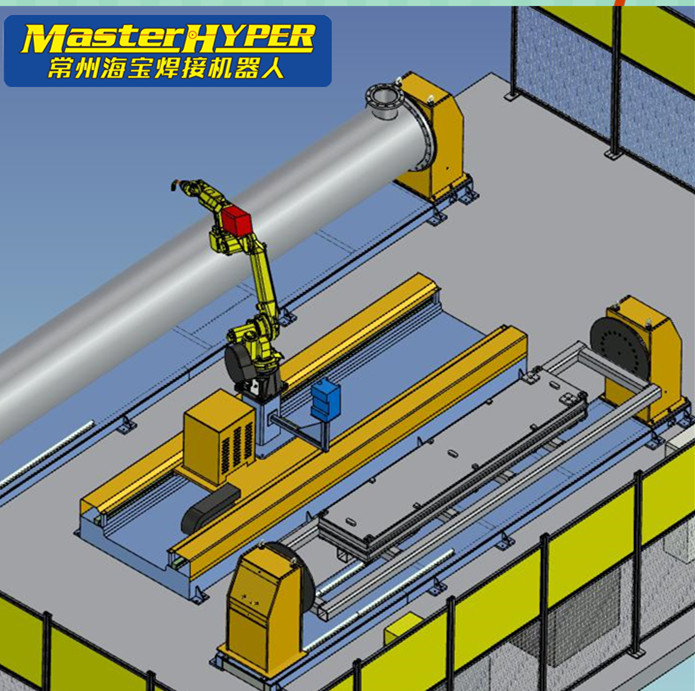 本機器人焊接系統由一臺 FANUC M-10ia/8L機器人大運動半徑為2038mm,兩套機器人外部軸翻轉變位機,一套4米長度的機器人行走地軌,機械夾緊定位工裝,FANUC PM500焊接系統,焊槍清槍裝置,賓采爾焊槍套件,安全防護及電氣控制系統等組成。每臺工作站可協調聯動的總軸數為8軸,機器人安裝,安全、可靠。可以滿足長度3米的結構件,長度500mm-5500mm以內。管直徑50-630mm內的管法蘭焊接。
