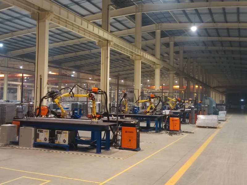 4)大機械手搬起焊接完成的大板,上升、平移、旋轉、下落放至大板運輸線上運走