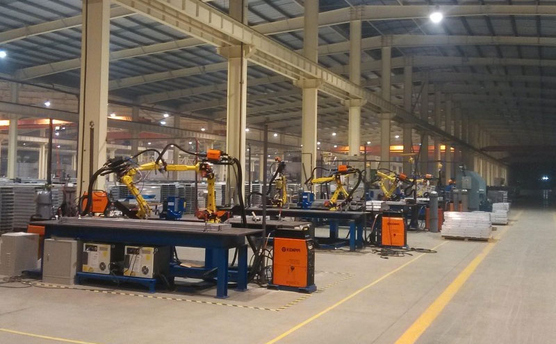 - 機器人鋁膜板焊接生產線主要包括一臺大板數控鋸床、一臺大板排沖床、一條大板運輸線、一臺封板和次肋數控鋸床、一臺封板排沖床、一條料筐運輸線、兩套雙工位焊接機器人工作站。