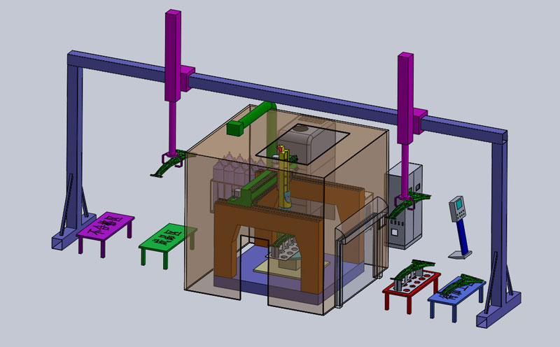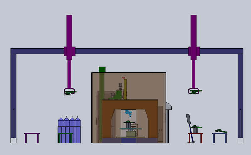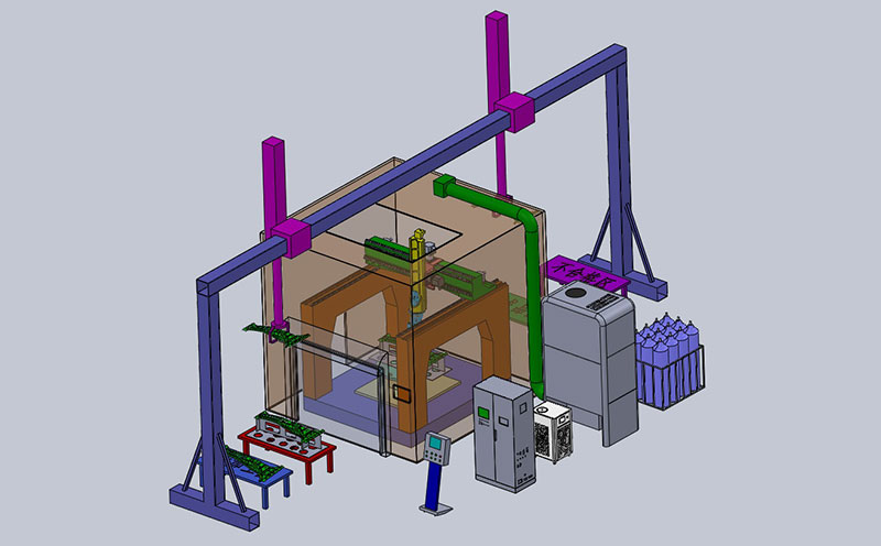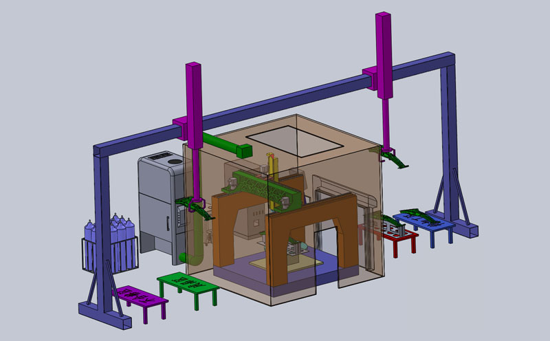 設(shè)備占地6.5m'7.5mt-4m。工件在上下料區(qū)域安裝和拆卸知,該區(qū)域全開放,配置安全防護,加工區(qū)域全封閉,保證生產(chǎn)操作人員安全,附屬設(shè)備放置于設(shè)備外側(cè)便于維護。加工區(qū)域內(nèi)架設(shè)監(jiān)控攝像頭,用于對加工過程的觀測。操作區(qū)域設(shè)置多處急停開關(guān),便于緊急情況的處理。
