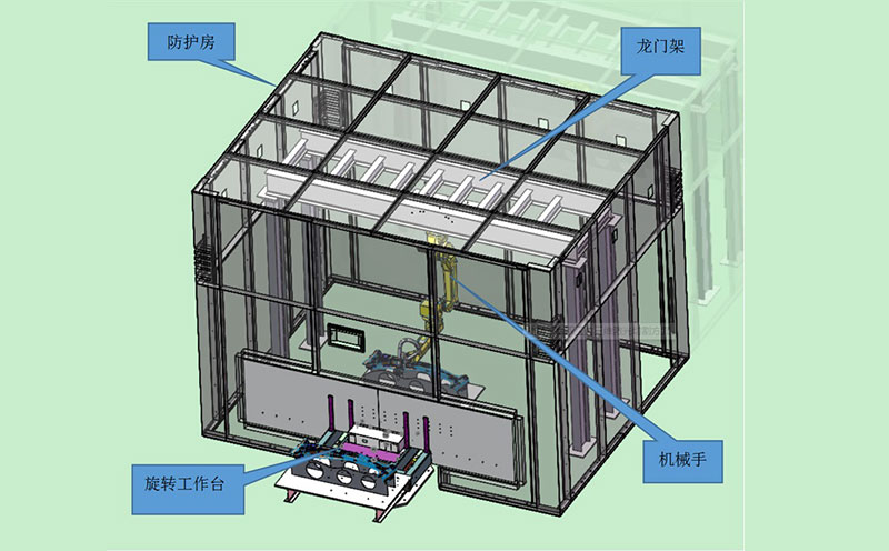 工作臺(tái)B在防護(hù)房?jī)?nèi)加工,工作臺(tái)A在外面上下料,加工完成后工作臺(tái)旋轉(zhuǎn),工作臺(tái)B在外面上下料,工作臺(tái)A在防護(hù)房?jī)?nèi)加工。